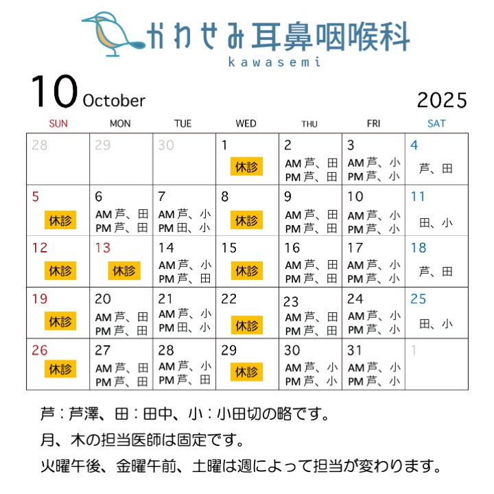 10月の予定表です。予約を取得する際のご参考にしてください。